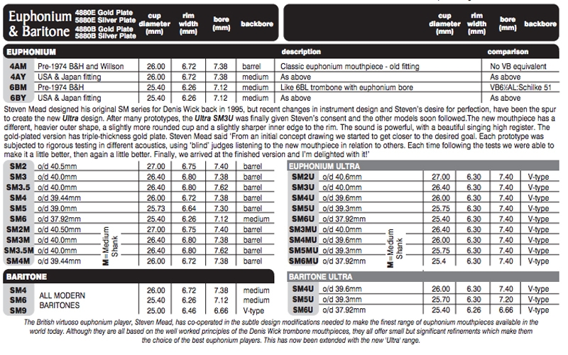 Todas las boquillas de Bombardino Denis Wick se basan en los principios probados de las boquillas de trombón y ofrecen refinamientos sutiles, aunque significativos, en la garganta y la parte posterior para complementar el agujero cónico del Bombardino. Los modelos Steven Mead presentan más refinamientos y dan como resultado una boquilla que sobresale por su precisión, articulación, flexibilidad, alcance y respuesta general.