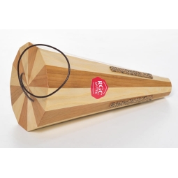 Sordina de trompa RGC TPA03 fabricada en madera de cerezo americano y fresno frisé, con diseño dodecalateral exclusivo de RGC. Incluye tudel interior ajustable, refuerzo de cobre, y corcho-caucho de alta durabilidad. Acabado en laca satinada con ceras naturales, y bolsa de tela con cordón de cuero artesanal. Fabricada a mano en España.